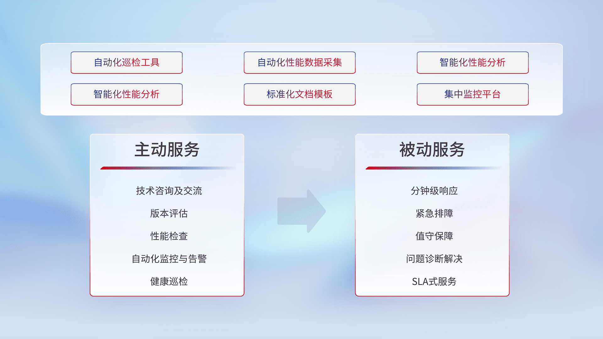 智能化工具和标准化文档,,,保障服务质量,,提供主动服务(包含技术咨询、、版本评估、、、性能检查、、、、自动化监控与告警、、、、健康巡检)和被动服务包含(分钟级响应、、、、紧急排障、、值守保障、、、问题诊断解决、、、SLA服务)。。。